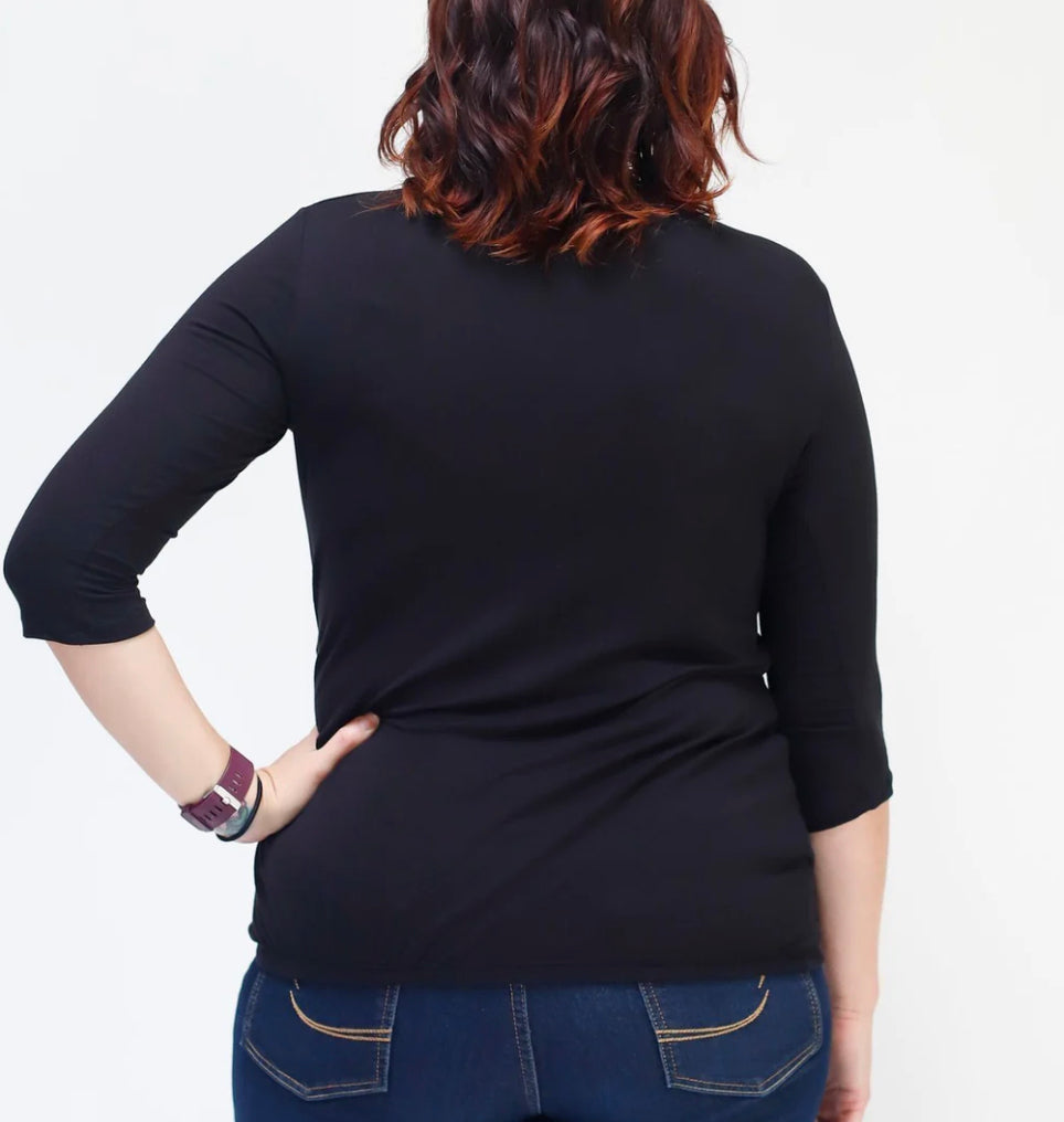 To access the left breast, simply move the front fabric to the right and move to the left the inner layer. The nursing access for this top is in the center of the shirt, so while great for convenient and discrete nursing of one child it may not work well for tandem nursing pumping with a double pump.