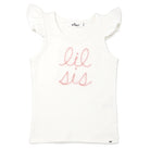 Perfect sibling gift for the Little Sister. Appliqued "lil sis" spelled out in pink and gold sparkle yarn with flutter sleeves.