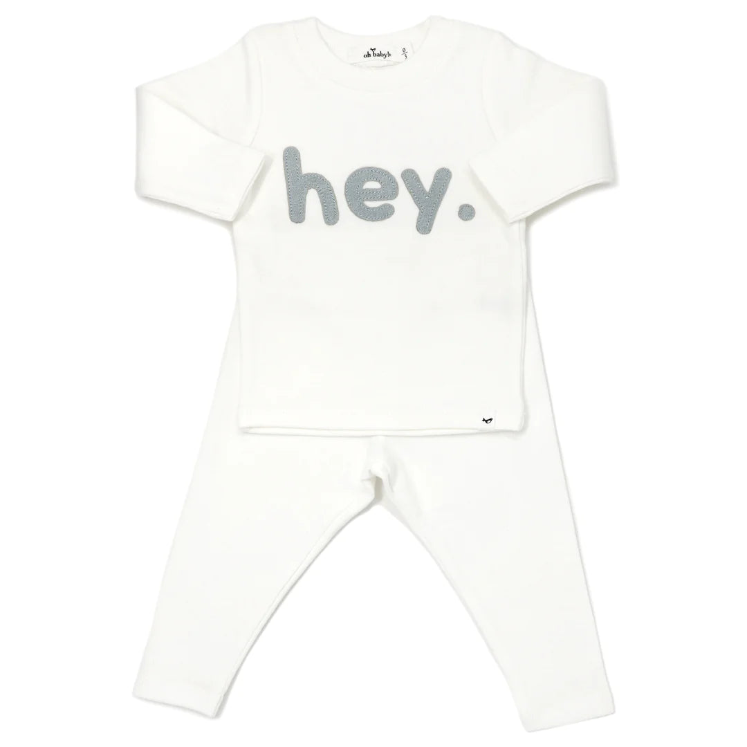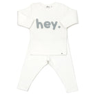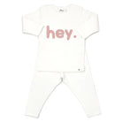 Hand appliqued "hey" on a soft cotton long sleeve tee with matching pants. Machine washable. Available in infant sizes. Designed in Minnesota.