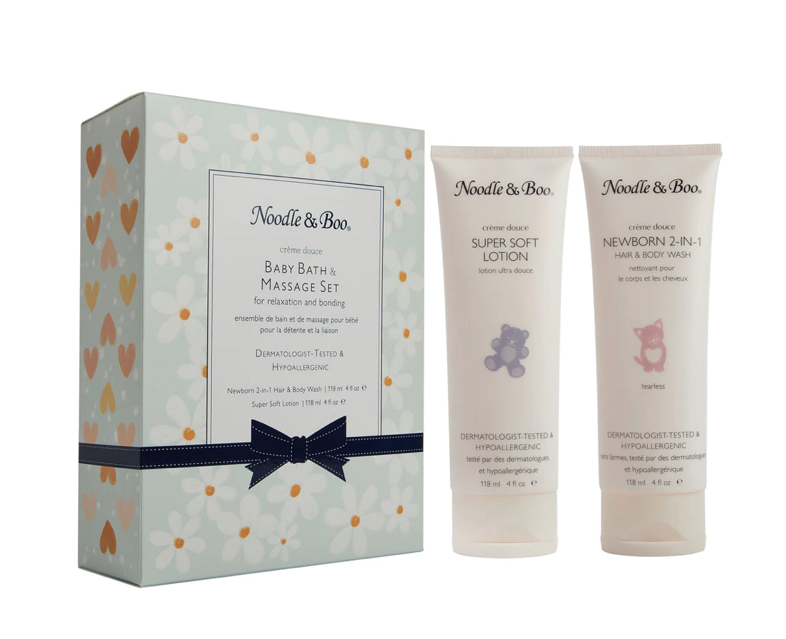 - The set includes 4 ounces of Newborn Hair & Body Wash and Super Soft Lotion.