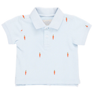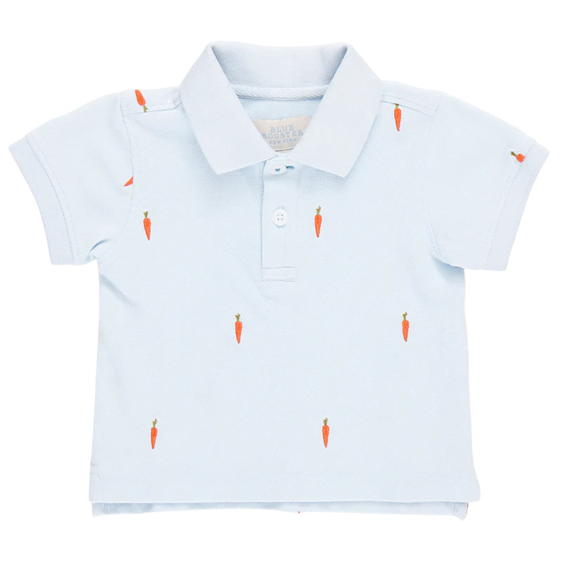 Hop into Easter style! The sweetest little embroidered carrots are sprouting on our Boys Alec Shirt. Your little bunny will look darling in this short-sleeved shirt crafted in a classic sky blue pique. Details include a 3/4 button closure at the front collar, soft ribbing at the arms our signature bright blue thread detail on the top button. Match with our Baby Boys Alec Jumper in Carrot Embroidery for a buttoned up big brother / little brother look.