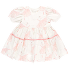 New Silhouette! Beautiful long lined ballerinas stretch and leap across our classically styled Girls Meredith Dress in our pretty new Ballerinas print. Perfectly Pink Chicken details include a fully gathered 2-tiered skirt, short puff sleeves and a pink velvet ribbon accent at the hip. A silver metallic thread detail shines throughout the piece. Your little dancer will surely want to twirl away the afternoon in this lovely dress.