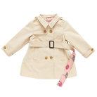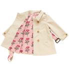 New and Notable! Our Girls Trudy Trench Coat is a super chic addition to your little's wardrobe. Open the classic double breasted beige trench to find our gorgeous Blush Marigold print lining the coat's interior. Exceptional details really set this piece apart: faux horn buttons up the front and at the shoulders and wrist; removable fabric lined belt with faux leather slide buckle and roomy side slit pockets. Wear Trudy rain or shine, you won't want to hide it in your closet! Full length. Water resistant.