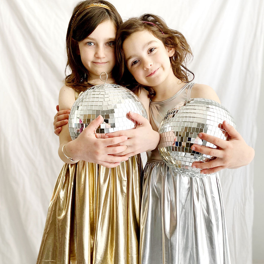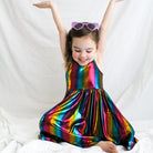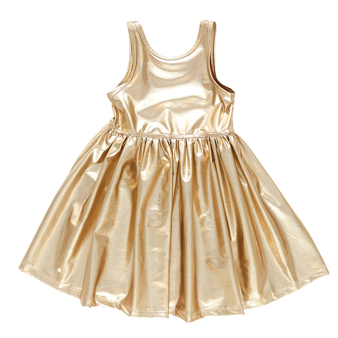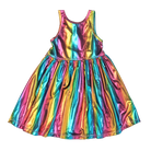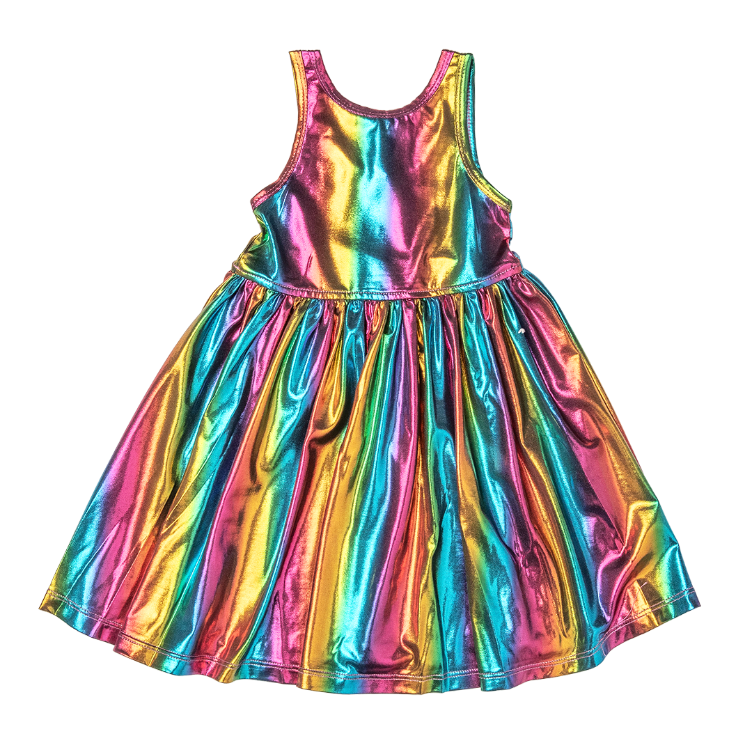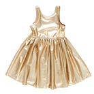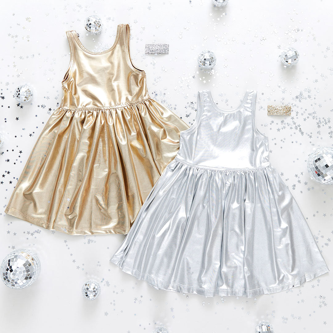 Razzle Dazzle 'Em! Get your shine and sparkle on in our Girls Liza Lame Dress. Your little will love this super cute tank style featuring a fully gathered elastic waist skirt and a low scoop back. Available in Silver, Gold and Rainbow Lame.