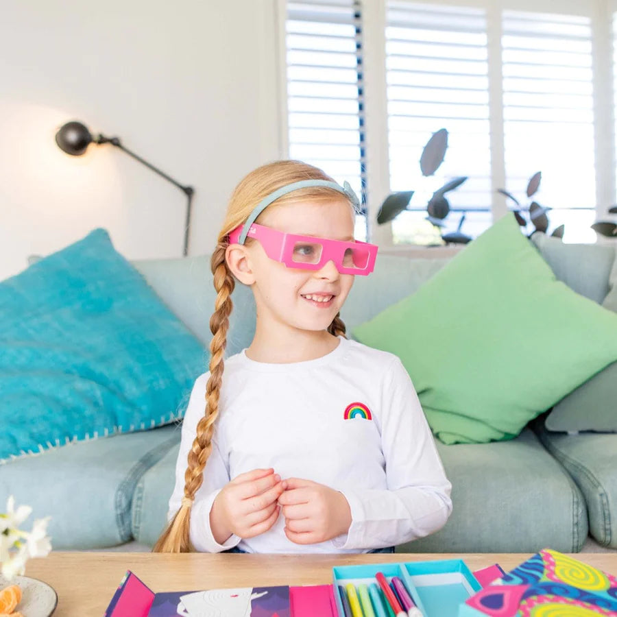 This super cool set allows you to create awesome optical illusions. Simply colour in (using the warm/cool principle*), put your special 3D glasses on and watch your artwork pop off the page!
