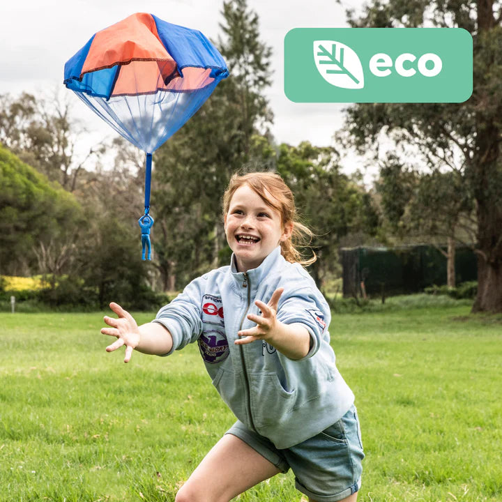 Parachuters is part of our new Eco range, with bioplastic Parachuter, recycled RPET parachute and packaging made of 100% recycled paper.