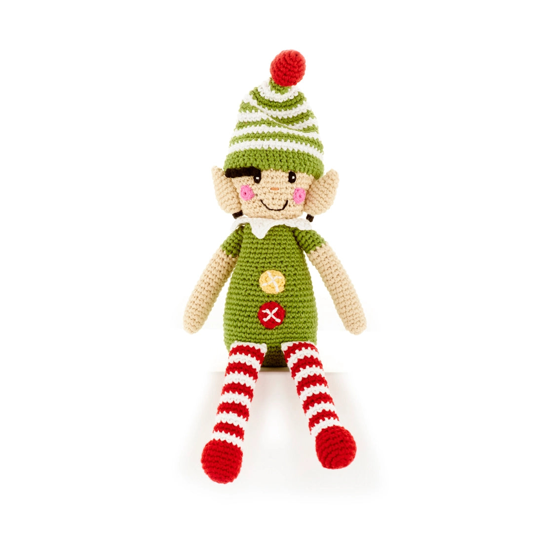 This happy elf cannot wait for a companion to join him on his escapades. He is on a secret mission to be Santa's helper and he wants your little one to help him. This knit rattle is handmade with cotton yarn and is soft and lightweight and gives a soft jingle when shaken.