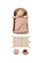 I'm a handmade textile doll made with a lot of love. My set includes a mini crib with a mattress, pillow, and bedding, as well as a decor set featuring miniature versions of our best-selling designs, such as the Aztec rug, Tassels basket, and Chill pouf to decorate my lttle home.