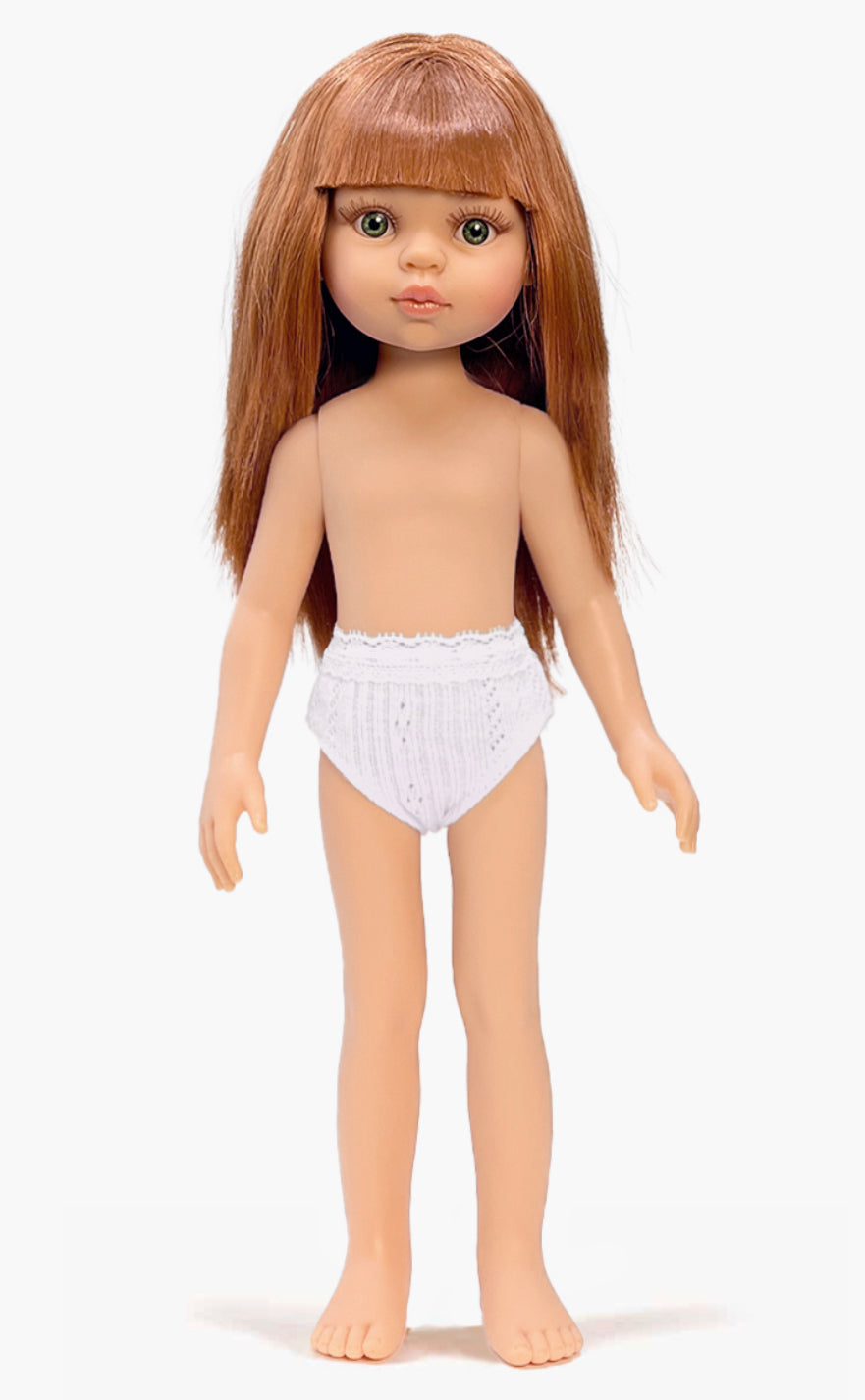 32 cm body in vinyl, phthalate free, hair with bangs implanted by hand, staring eyes with eyelashes and eyebrows painted.
