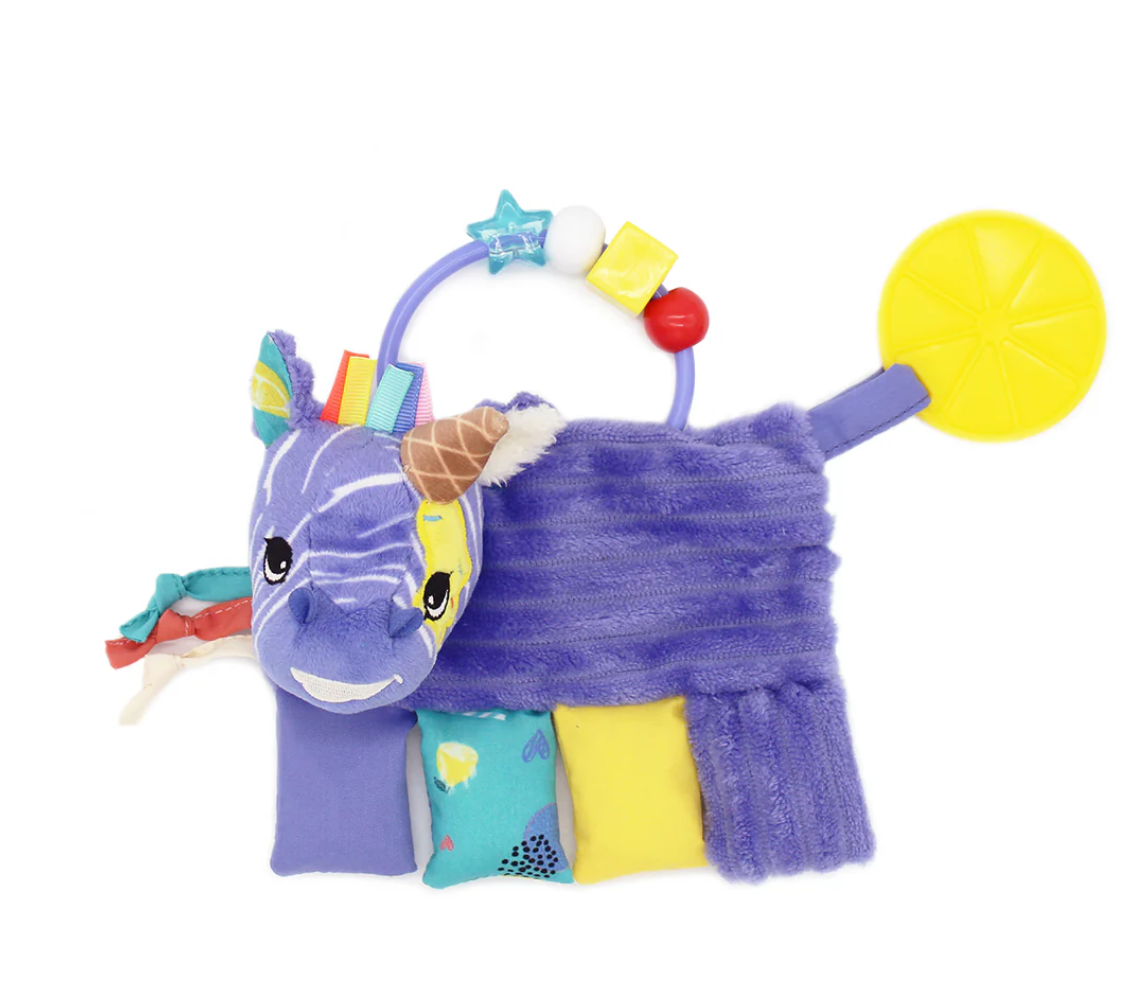 This activity rattle is based on the Kiprokos The Zebra style and has all the things a baby loves! Different textures, a teether, and all the things a baby needs to stimulate their sensory intelligence and imagination!