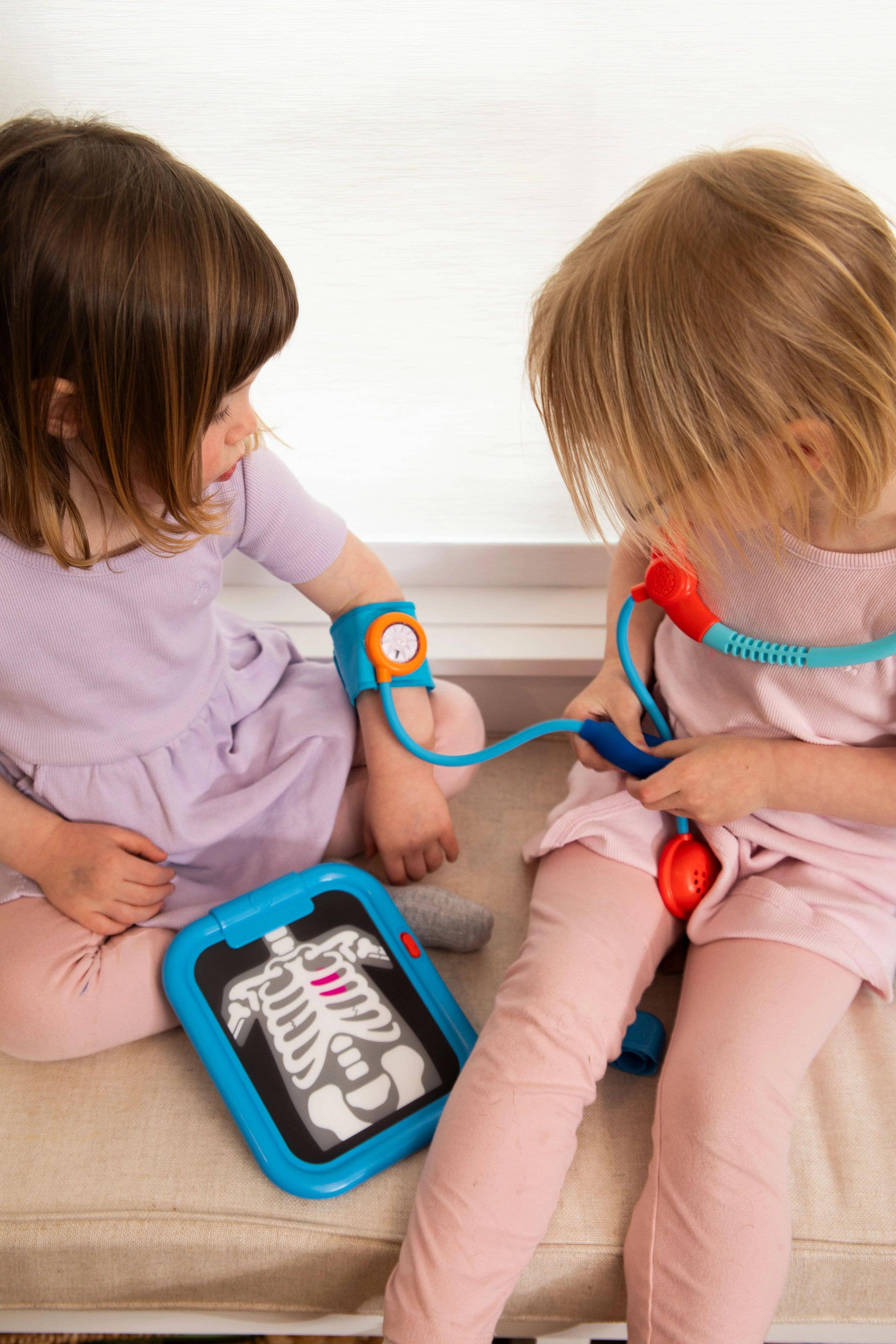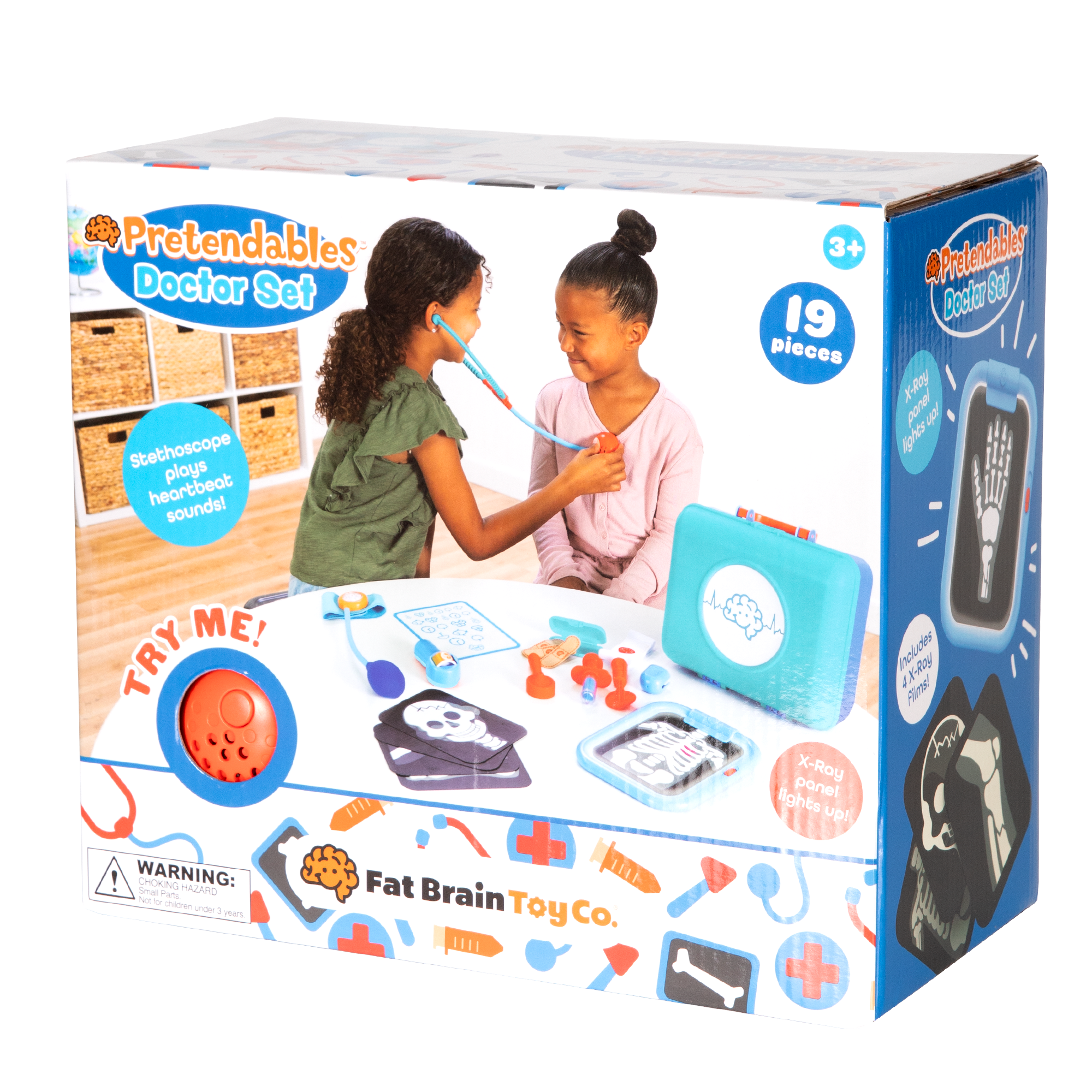 A thermometer, a finger oximeter, an otoscope, a reflex hammer, a stethoscope with real heartbeat sounds, a box of bandages, a syringe, health charts, a light-up x-ray panel, and more, all stored in a snap-shut case... This playset has everything kids need to go from diagnosis to treatment to 100% cured in no time at all. And you don't even need insurance! Give your future doctor a quality head start with the Pretendables Doctor Set. Pretendables Doctor Set Pretend-play doctor set with snap-shut storage case Encourages imaginative play, role play, communication skills Stethoscope features heartbeat sound X-ray panel lights up to illuminate x-rays Includes stethoscope, x-ray panel, x-rays, health charts, ID badge, thermometer, finger oximeter, otoscope, syringe, reflex hammer, snap-shut box of adhesive bandages, roll of gauze, snap-shut storage case High-quality materials and construction - Lasting durability Ages 3+