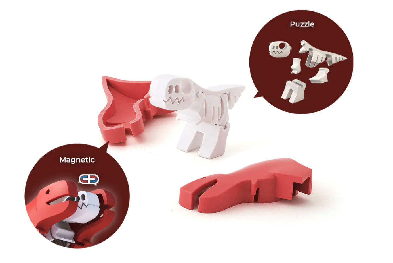 T-Rex is part of a collectible Half-Dinosaur series that combines multiple sensory learning and play styles into one package. Complete with a diorama for an immersive Dino adventure, the toy has interactive magnets to satisfy snapping (clicking!) needs and a skeleton puzzle for endless tinkering. Collect and connect them all to create your own prehistoric world. Present your LearnPlay HALFTOYS® on a child's book case, avid collector case or personalize your desk at work.