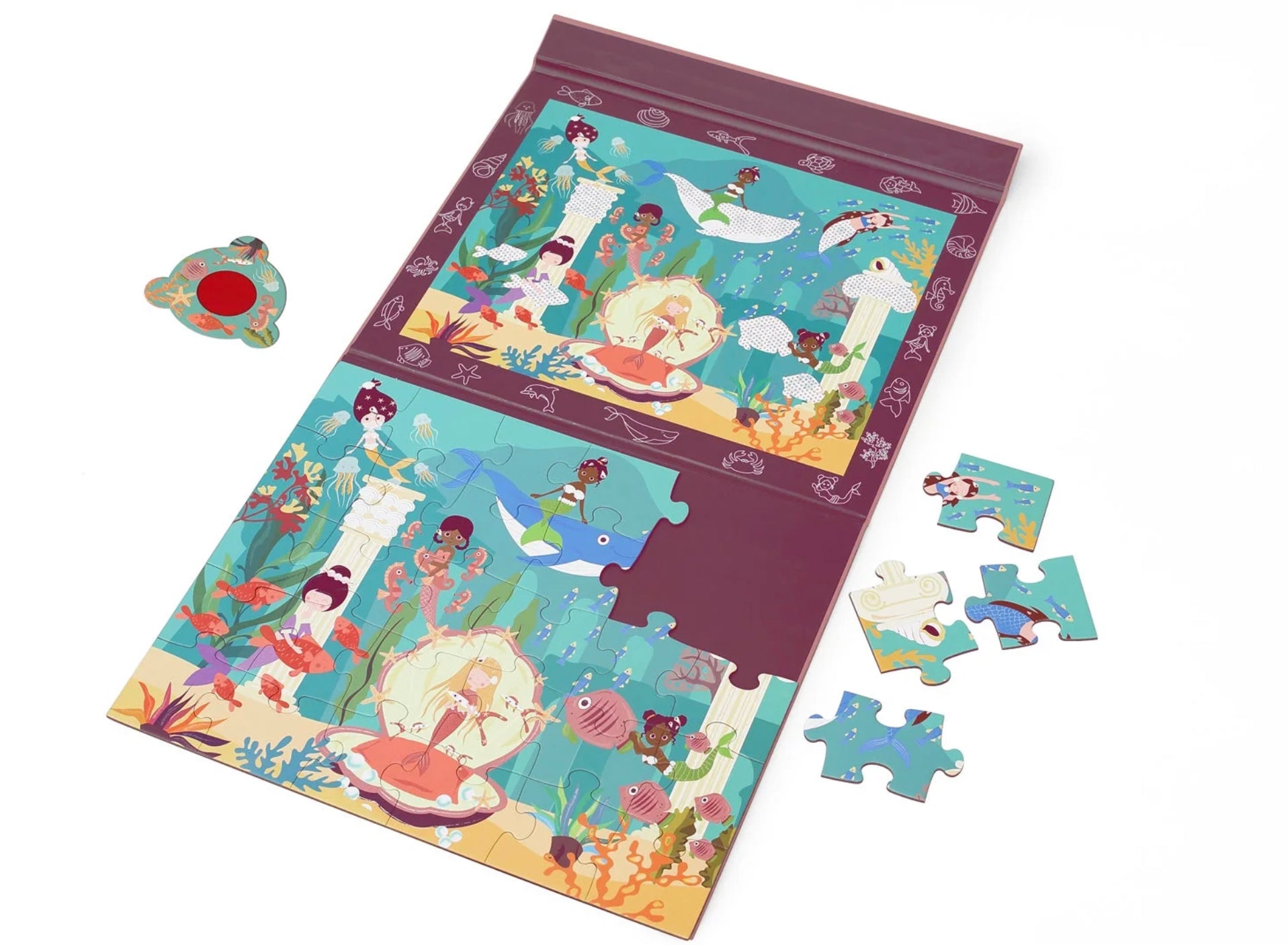 This Mystery puzzle is one that is full of surprises! Create the 30 piece puzzle and use the special lens to discover all the hidden secrets of the wonderful world of mermaids in the picture! The puzzle is magnetic and is the perfect size to easily be taken anywhere.