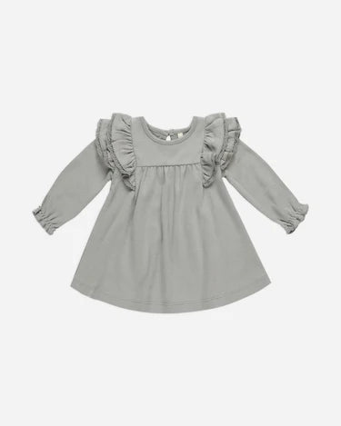 Velvety soft flutter long sleeve baby dress with button back neck closure. Pairs perfectly with our gathered bloomers!