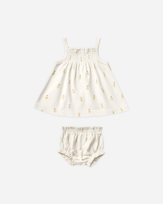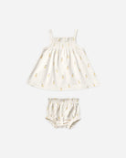 Sweet and easy set with a smocked neckline and a full silhouette. Gathered bloomers include elastic waist and elastic leg openings.