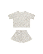 Lounge away your summer days in this cozy set - a drop shoulder top and matching shorts with ruffle detail at the hem.