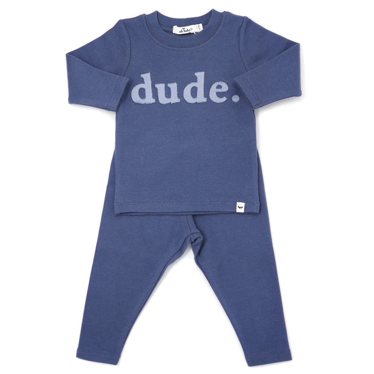 Hand appliqued "dude" on a soft cotton long sleeve coal tee with matching pants. Designed in Minnesota. Available in infant sizes.