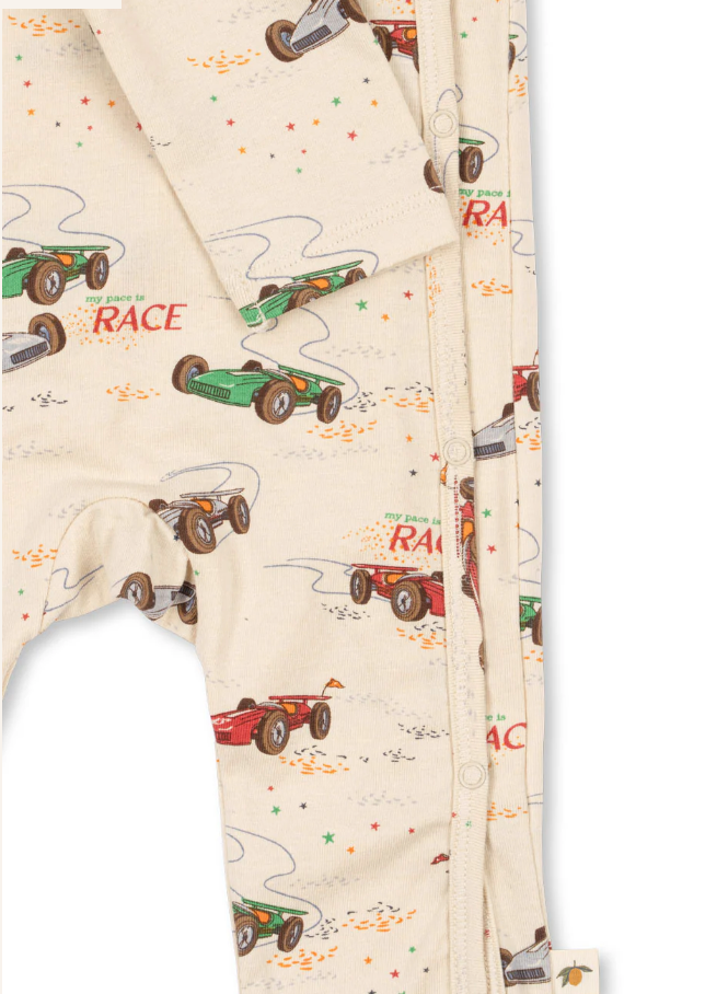 Soft onesie for newborns in a light cotton blend with a hint of stretch. Designed with a wrap closure that features snap buttons along the body and legs for easy dressing.