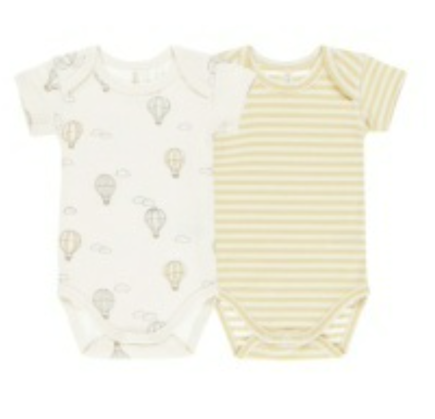 This 2-pack of short sleeve bodysuits features playful hot air balloon and yellow stripe designs, crafted from soft, breathable fabric to keep your baby comfortable all day.