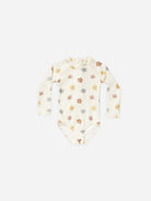 This one-piece rashguard swimsuit will have your little one protected from the sun in style. Featuring a zipper front closure and ruffle details at the leg openings.