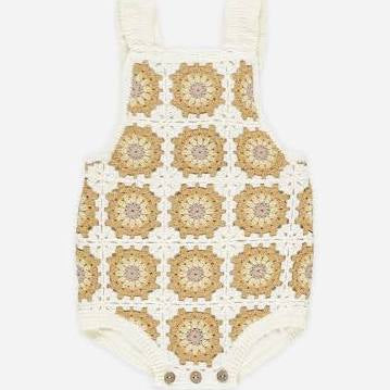 This Crochet Romper has ruffle criss-cross straps with a button back attachment, and bottom buttons for easy changes.