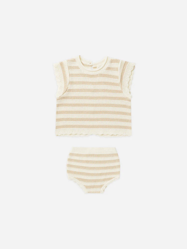 This crochet knit set has all the throwback vibes with scalloped short sleeves and edges, buttons on back with opening on bottom half, and coordinating bloomers with scalloped edges.