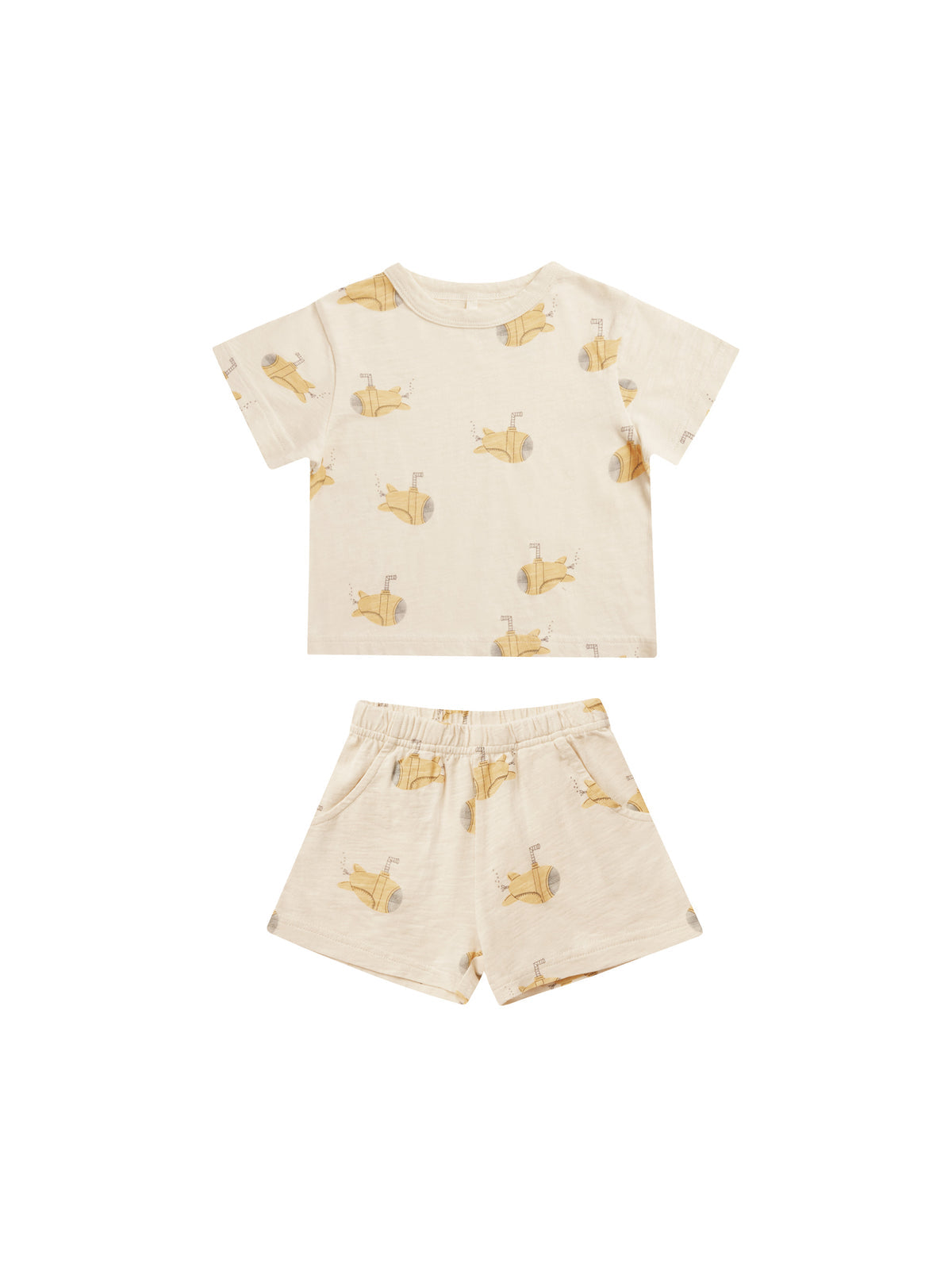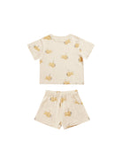This ultra soft cotton jersey set includes a short sleeve top and coordinating shorts with an elastic waist and side pockets.