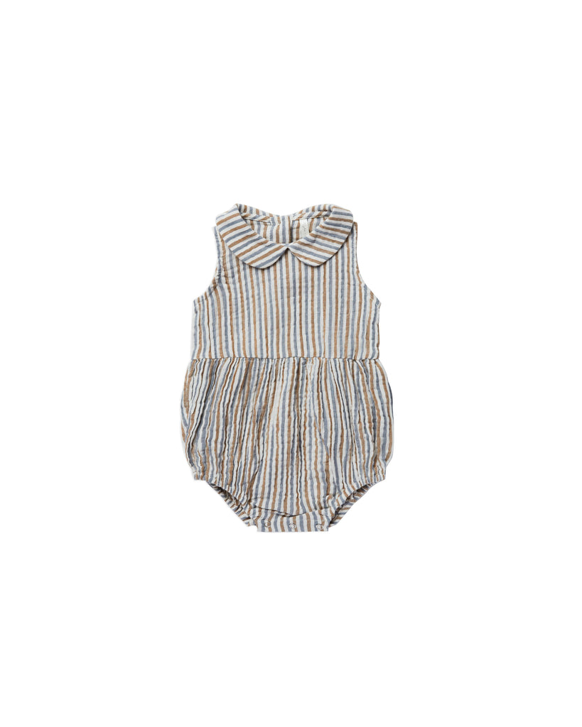 Sweet baby onepiece romper featuring a peter pan collar, button closure on the back for easy changing, and snaps along inseam. Featuring our 'nautical stripe' print.