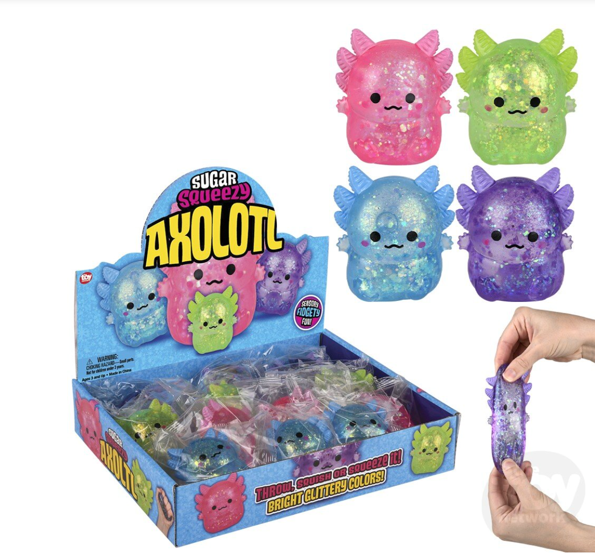 This 2.5" Squeezy Sugar Axolotl provides great stress relief fidget in axolotl form. Assorted colors. 12 pieces per display.