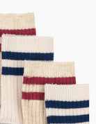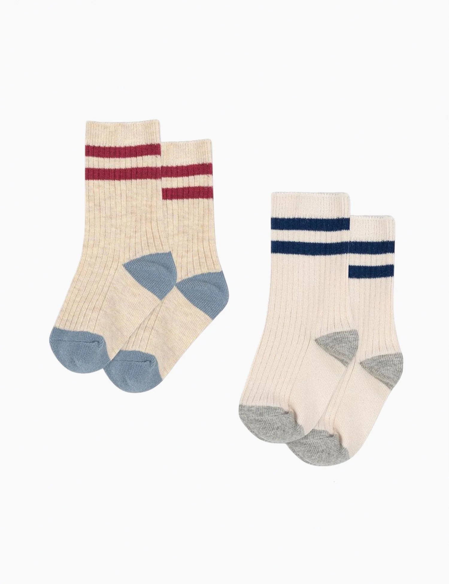These Rib Socks are made from a super soft organic cotton. They feature classic rib detailing for a snug fit, and are designed with a reinforced heel and toe for durability. The 2-pack includes an off white sock with a gray toe and heel and navy stripes at the ankle, and a creme melange sock with a light blue toe and heel and red stripes at the ankle.