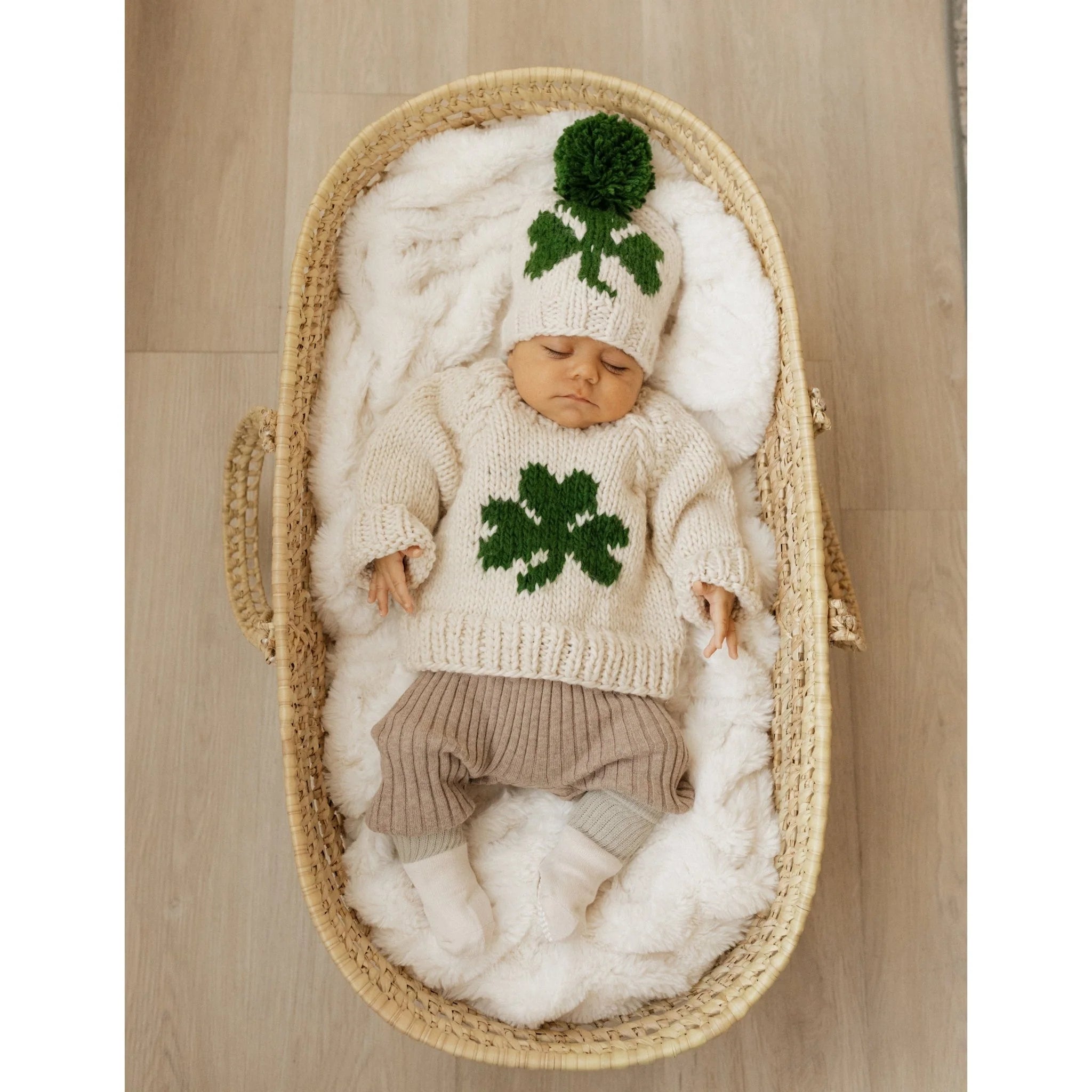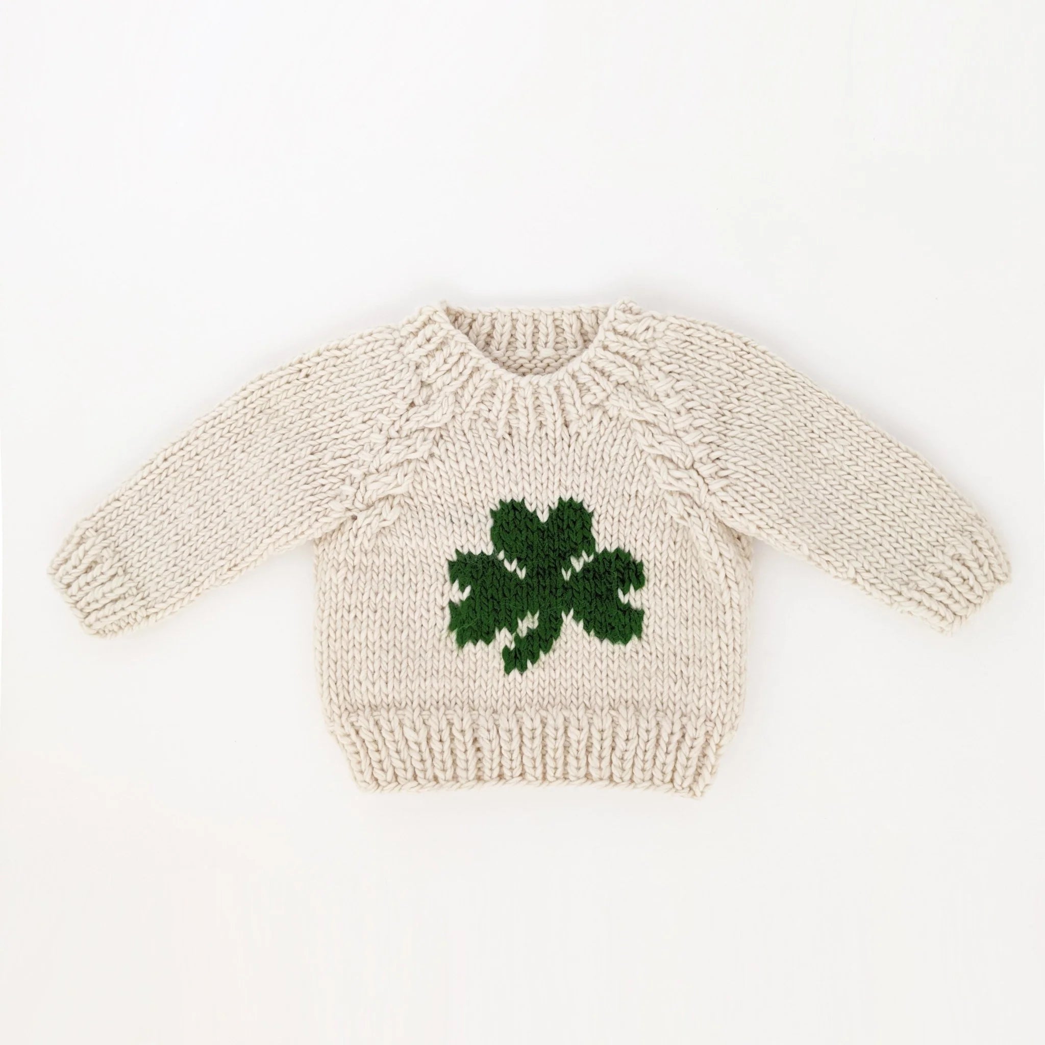 How about a little luck o' the Irish with our Shamrock Sweater? Hand-knit in chunky yarn, this crew neck sweater in Natural has a Shamrock knit in Kelly Green yarn. Hand knit, it is soft and warm. This is such a great gender neutral sweater, perfect for any little person. Make sure you buy the matching Shamrock Beanie Hat to go with this.