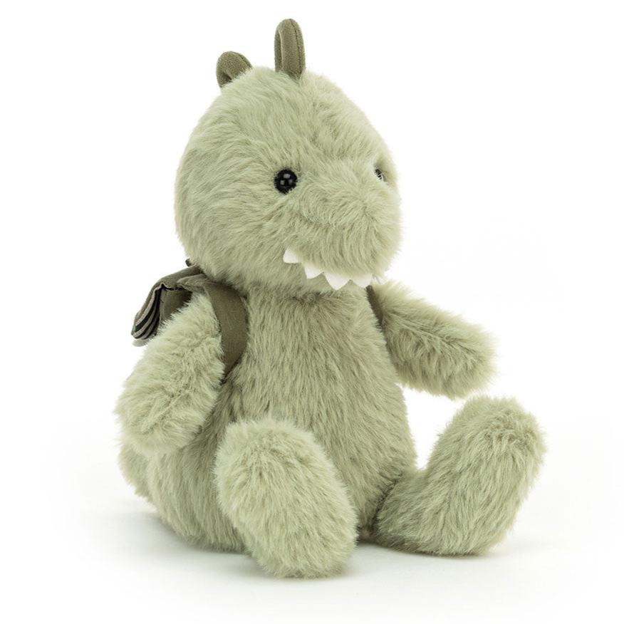 Ready and roaring for a weekend's camping, Backpack Dino is keen to get stomping! This scamp has tussly sage-green fur, soft baby teeth and squidgy mossy spines, not to mention a neat little suedey rucksack! Swish that tail and sing a campfire song!