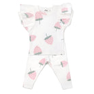 Butterfly Sleeve two-piece outfit features a short-sleeve tee with flutter accents. Set is in cream with all-over strawberry print. Snuggly soft cotton top and matching pants. Designed in Minnesota. Available in infant sizes.
