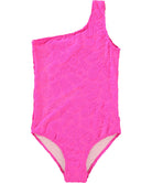 Pink one-shoulder swimsuit with a pattern of exotic fruits and UV protection 50+. The swimsuit has a regular fit, asymmetrical wide strap, and is fully lined.