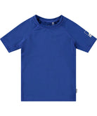 short sleeve rashguard for active children made from recycled polyester with UV protection 50+. The rashguard has a close fit, stand-up collar, and short raglan sleeves. It is comfortable to wear in the stretchy material. The rashguard is white with a print of a colourful coral reef, fish, and sea turtles. The product is CE-marked and tested according to standard EN-13758-1.