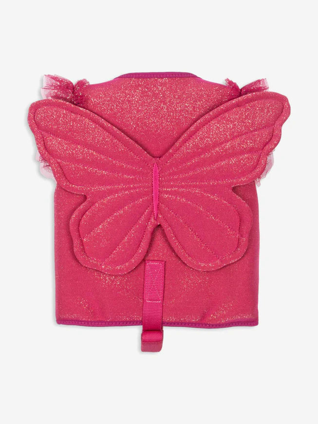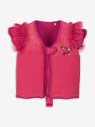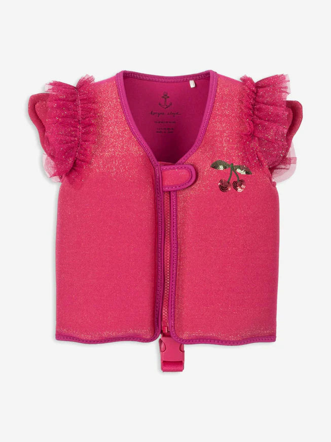Swim vest with tulle frills over the shoulders. A swim vest is the perfect accessory when your little ones are just beginning to splash around. It adds natural buoyancy and helps them get comfortable in the water while learning to swim on their own Our swim vests are designed with inside foam sticks that can be adjusted according to the child’s skills and needs. The float sticks can easily be removed one by one as your child develops their swimming skills. Always remove the sticks in pairs starting with 1 & 1, then 2 & 2 and so on until your child is completely adapted to swimming by themselves