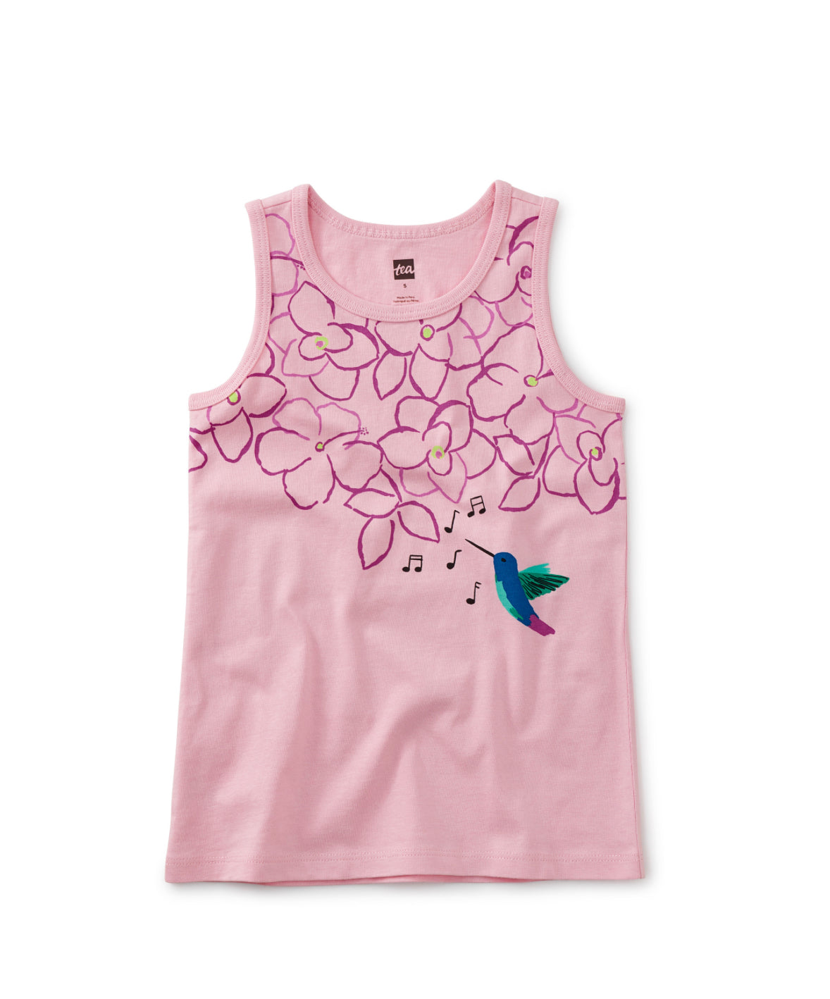 What a perfect image for warm weather adventures! This exclusive print captures a stunning blue hummingbird--a symbol of intelligence, beauty, and love--mid-flight. Like all our tanks, this is made to hold its colors and shape wash after wash. So soft, crafted of 100% cotton jersey. Pair with a Tea skort, skirt, or shorts to complete the look.