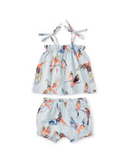 This sweet two-piece set looks delicate, but is made to hold up to so many sunny days of play. We've paired Tea's bestselling bloomers--the perfect combo of cuteness and comfort--with a matching top that features adjustable shoulder ties. Part of our Mexico collection, the parrot print is a Tea exclusive design. Crafted of breezy 100% soft cotton jersey.