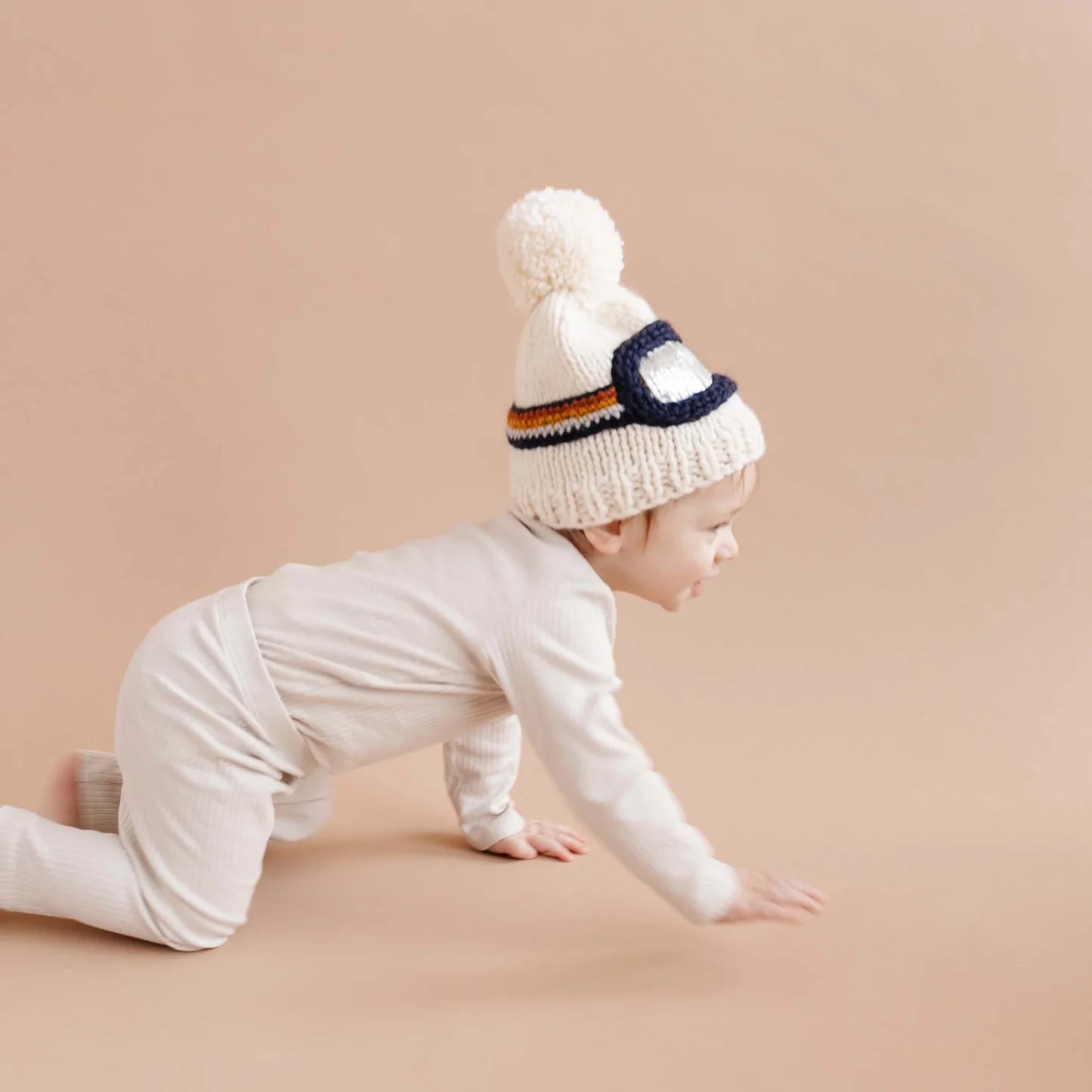 This soft Ski Goggle hat is essential for your little aspiring skier. With a colorful striped band and metallic faux glasses, it's the perfect accessory for winter. Goggle band includes Navy, Cinnamon, Mustard, and Bowie Grey colors.