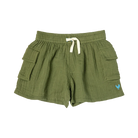 For the Boys! Play all day in our durable double cloth cotton gauze Boys Pull On Shorts. An elastic waist allows these bottoms to move with your child. Crafted in Capulet Olive and Dress Blues these match perfectly with any of our Boys Jack Shirts. Two side cargo pockets are well sized to carry all of a day's found treasures.
