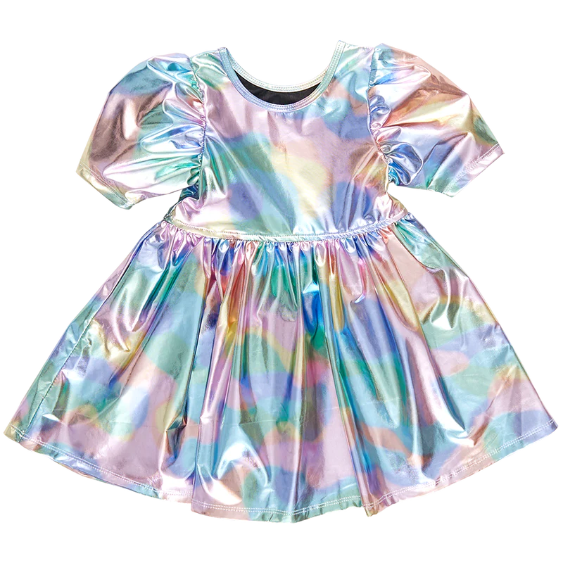 Electric Vibes! Your little rock star in the making will look brilliant in our flock favorite Girls Lame Laurie Dress! Fashioned in Blue Leopard, Cotton Candy, and Turquoise, this classic silhouette features a scoop neck, a gathered short puff sleeve and a full skirt that's tailor-made for twirling.