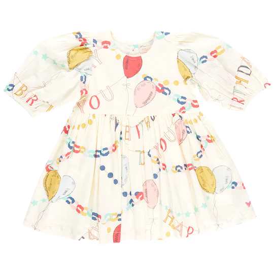 Party Girl! Celebrate your and your friends' special days in style in our classically tailored Girls Brooke Dress. Signature details include a gathered puff sleeve and pink glitter buttons at the back. Our playful Birthday Garland print delivers a celebratory message that's bound to make everyone smile. Looks great with our Girls Constance Sweater in both Rose and Cream.
