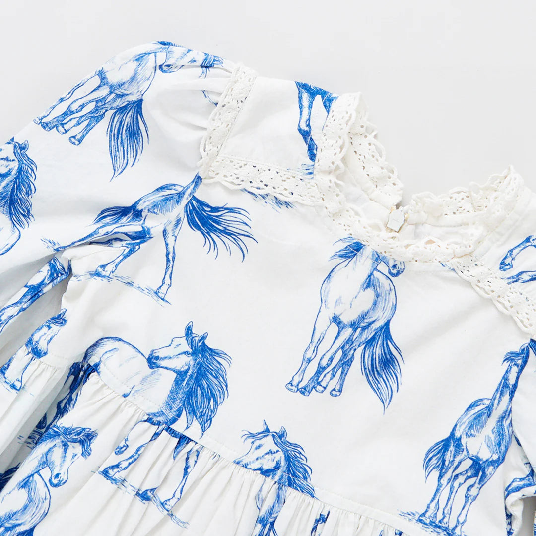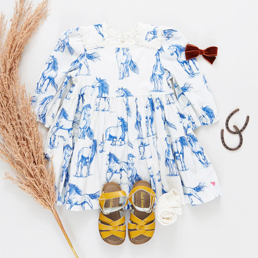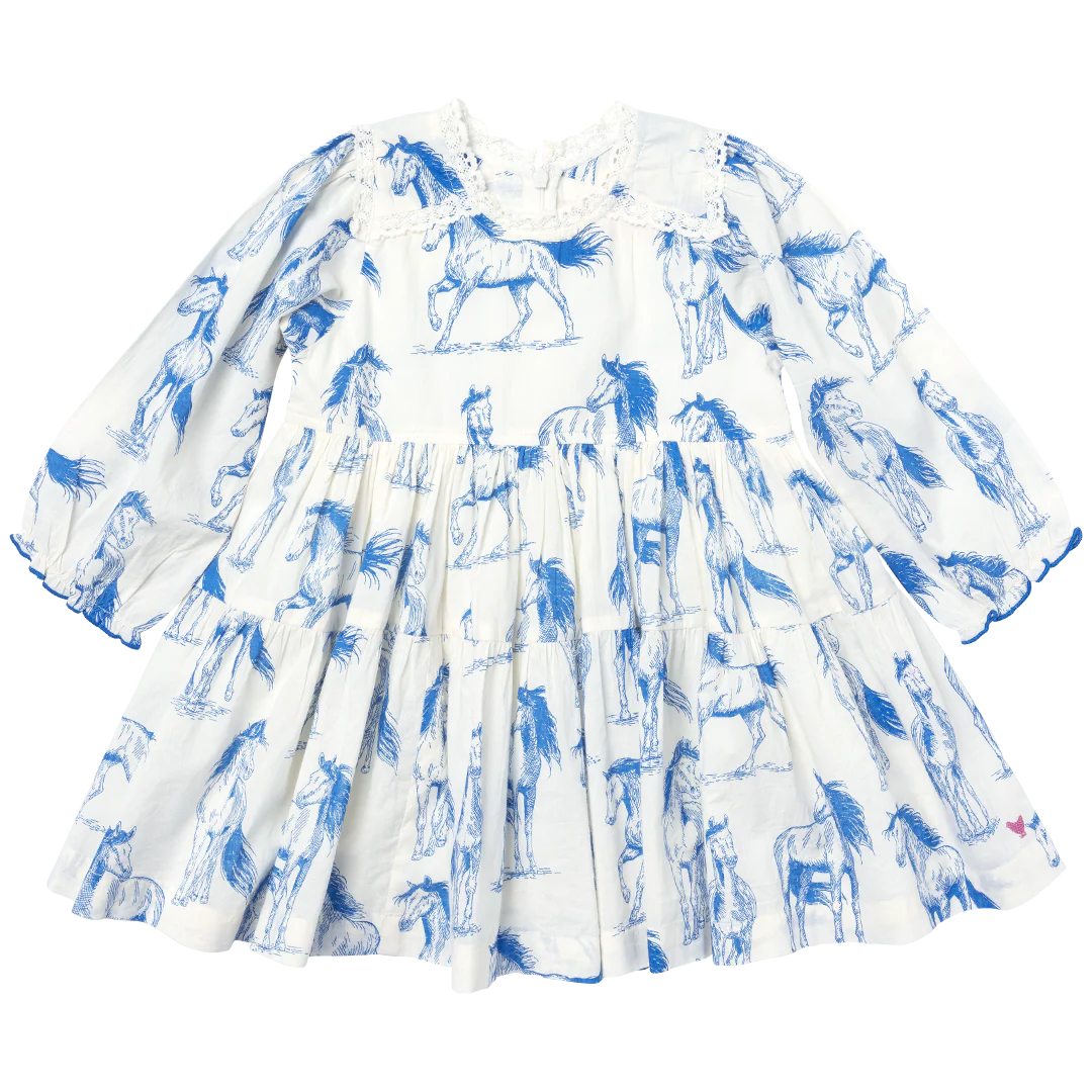 All the pretty horses! This whimsical new print for fall will have you foal-ing for our new-to-the-collection tiered Girls Charlie Dress. Delicate cotton lace details around the neck and shoulder lend a vintage feel to the piece. Invisible zipper at the back. Pair with our Baby Girls Charlie Bubble.