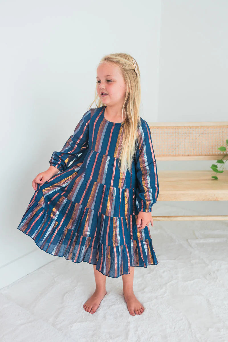 Navy Solid Color Lurex Tiered Long Sleeve Dress