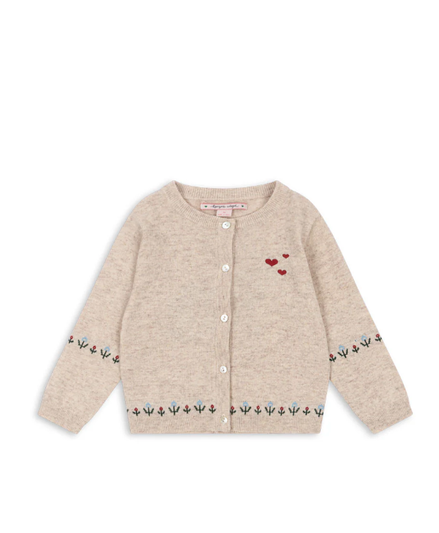 Soft cardigan in a warm lambswool blend. Classic rib hems and mother of pearl button closure.
