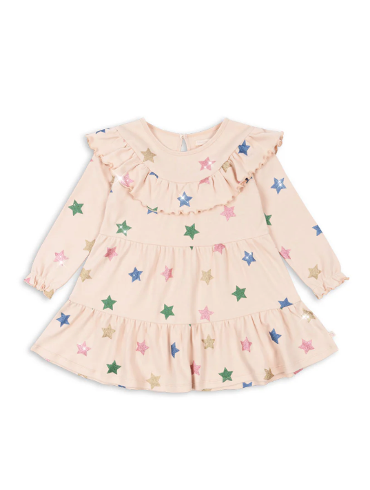 Soft cotton dress with sparkling glitter details. Designed with a slightly flared and layered skirt.