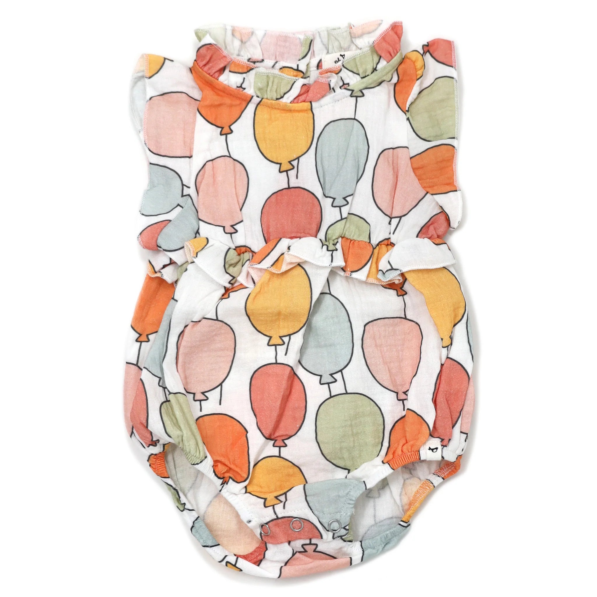 One piece bubble with ruffle accents. All-over multi colored balloon print. Designed in Minnesota. Fabric Content: 100% cotton