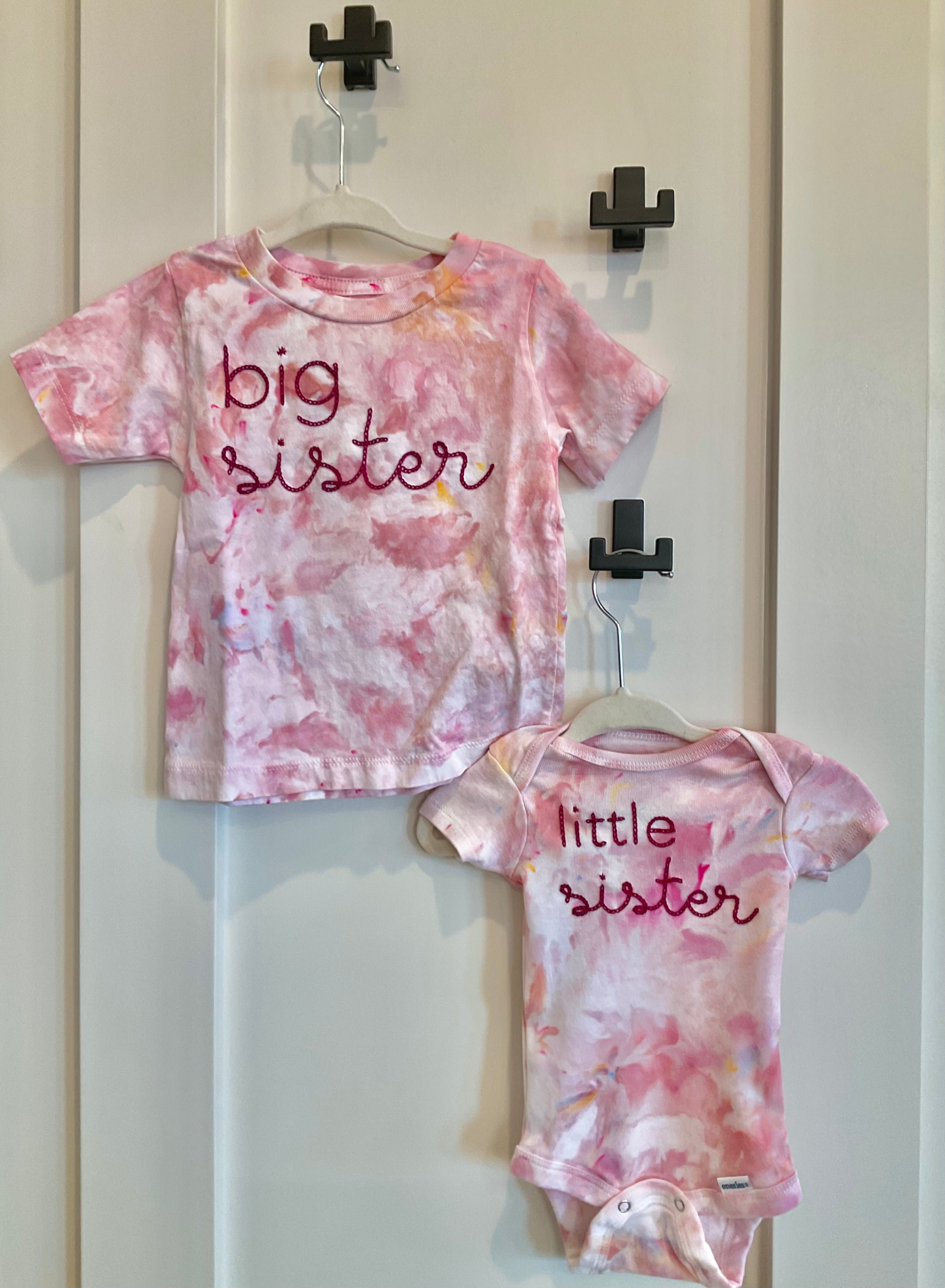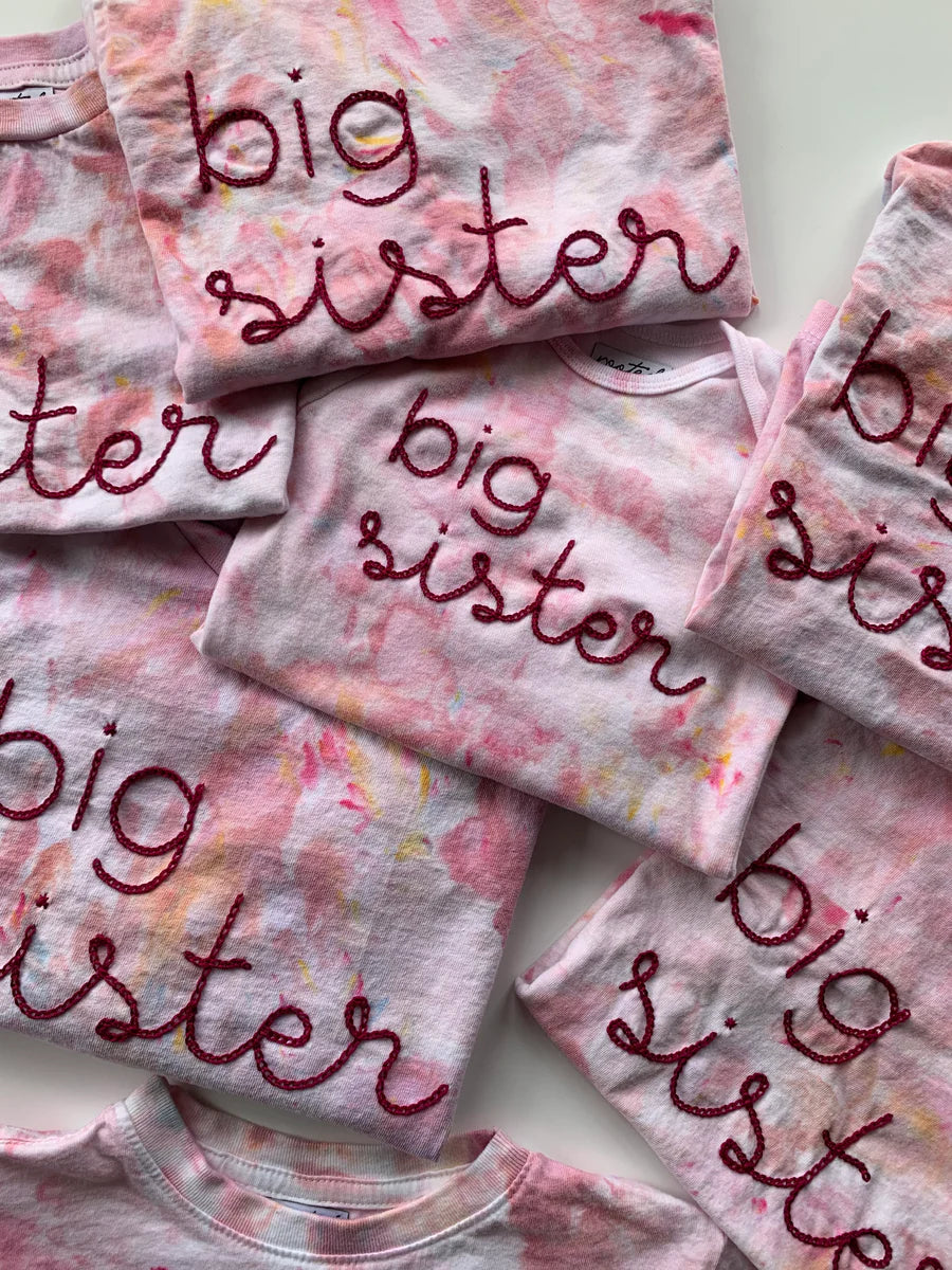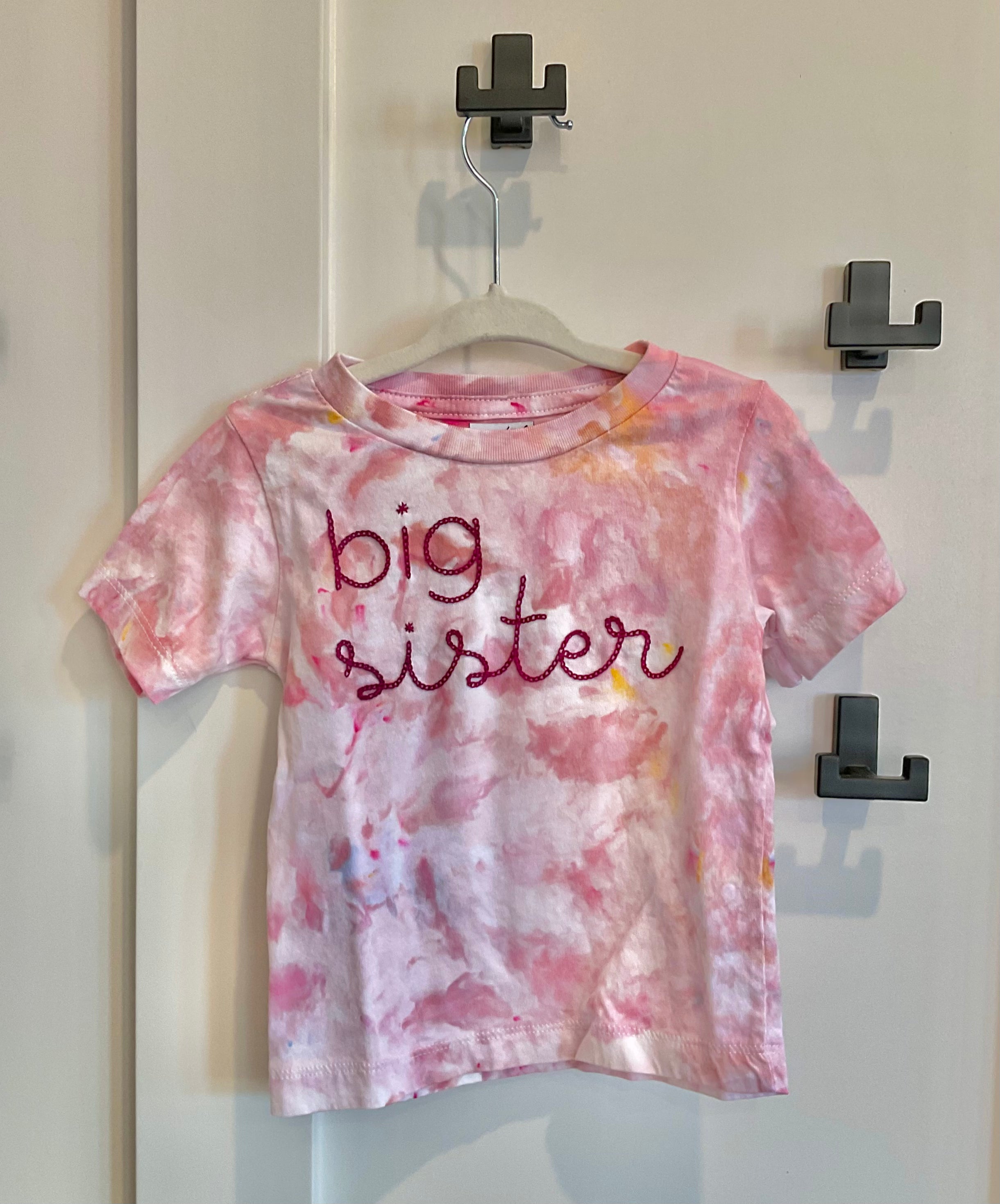 Ice dyed t-shirt with hand embroidered “big sister.”