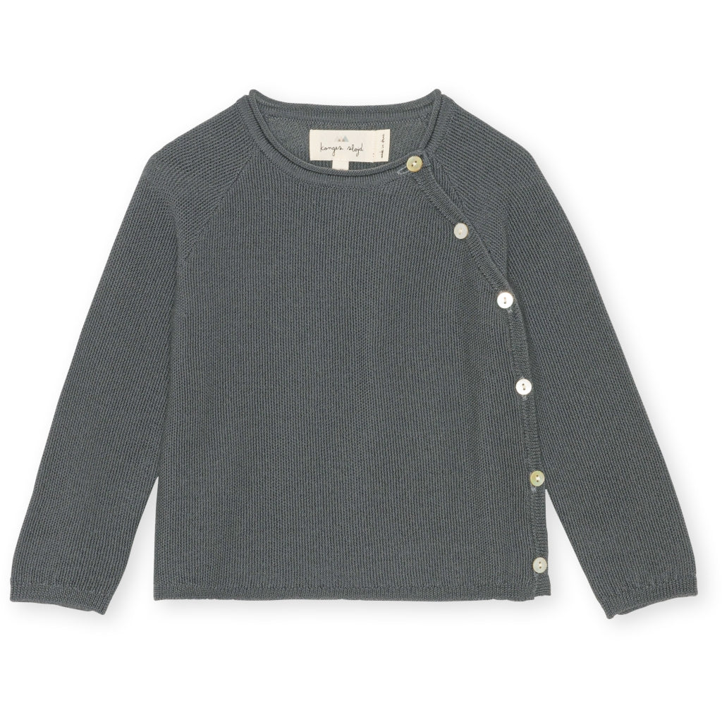 Snug and warm pearl knit cardigan made in 100 percent soft merino wool. Mother of pearl buttons along the side make it easy to wrap the garment around the child.