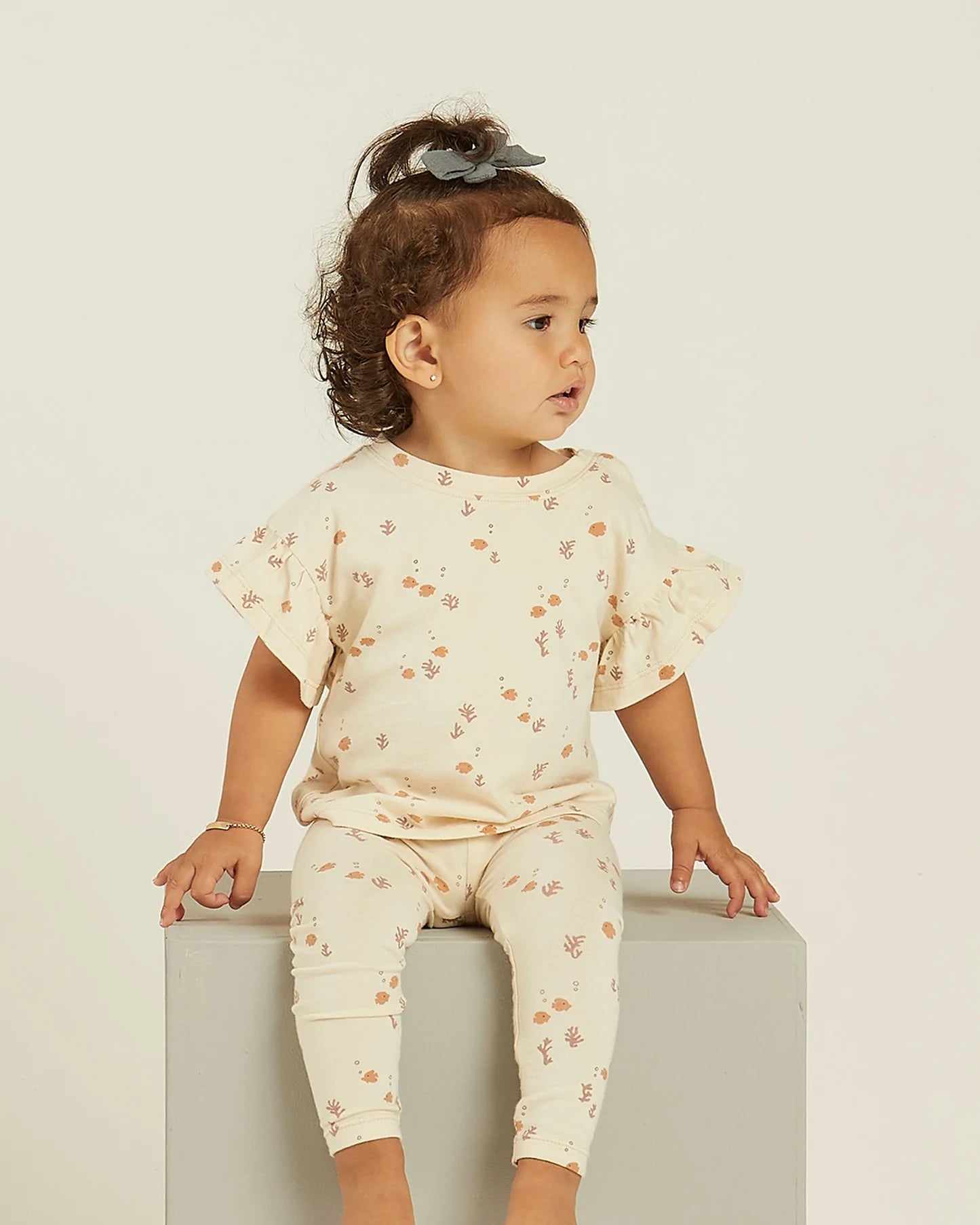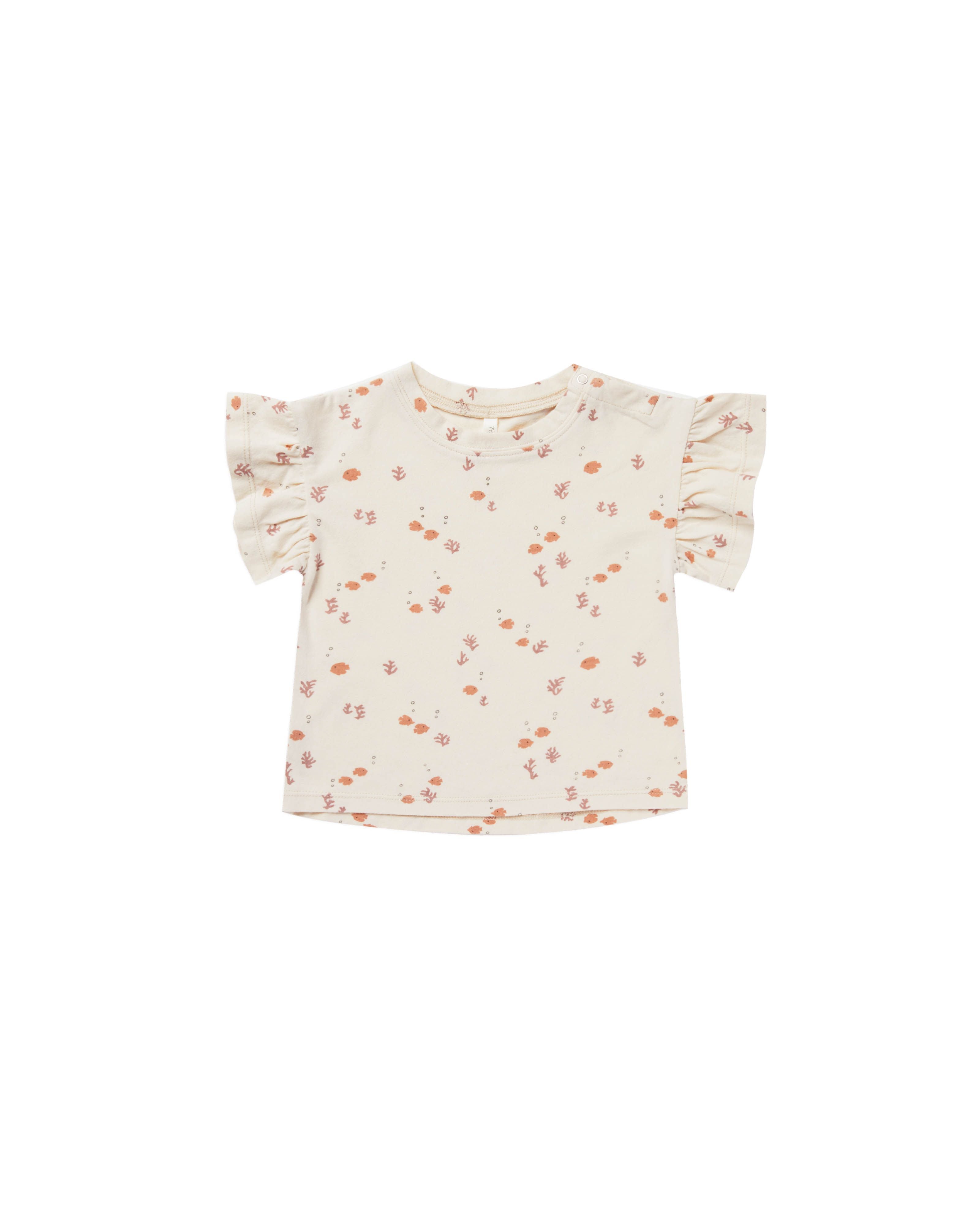 Extra soft + stretchy tee with ruffle sleeves. Baby sizes 0-3m thru 18-24m have snaps at the shoulder for easy changing. Featuring our 'angelfish' print on natural.